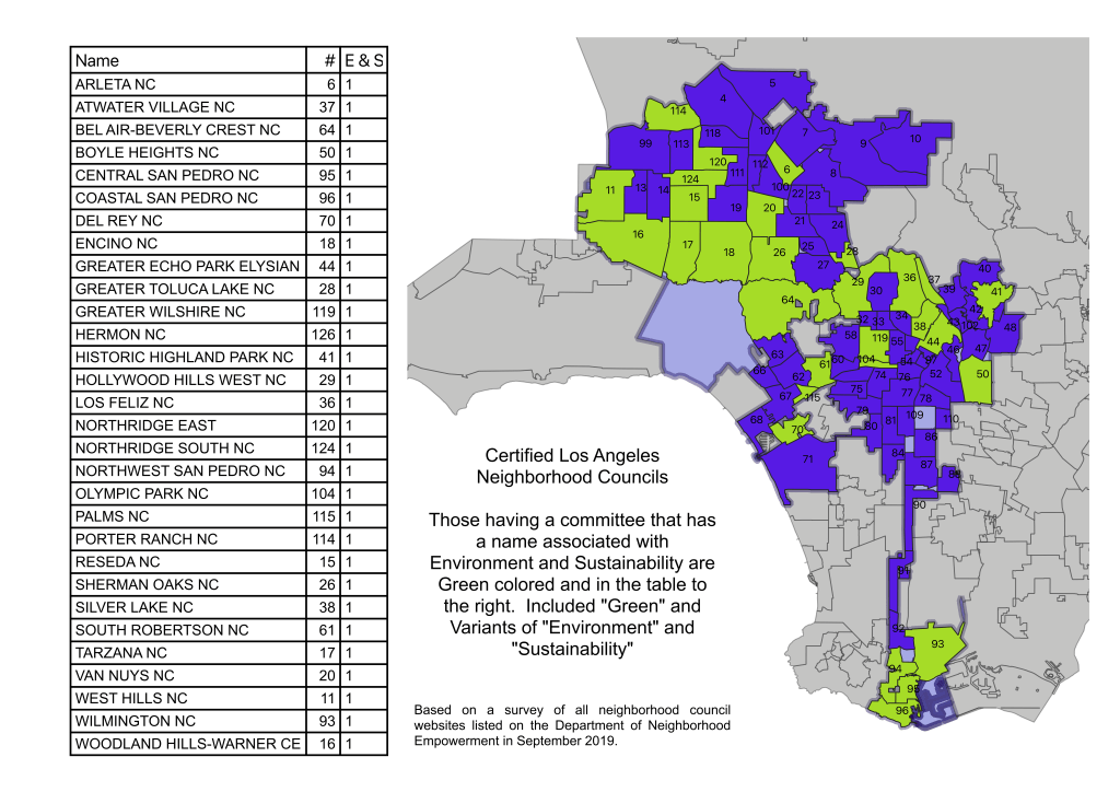 Prior to attending the Congress I was curious about which of the 99 Los Angeles Neighborhood Councils had committees with a focus on sustainability / environmental concerns. Starting with the websites listed on the Department of Neighborhood Empowerment’s council listing, I recorded the committees listed on each neighborhood council’s website. I was struck at the diversity of committees across the city (equestrian, historic preservation, wellbeing, arts, and emergency preparedness to name a few) but was focused on identifying those neighborhood councils that had a committee with some variant of “green”, “environment”, “sustainability” or “resilience”. While resilience generally has a different focus, I included that term as it suggests the neighborhood has concerns about the climate and the impact it will have on our lives. In all, I found that about 25 of the neighborhood councils had standing committees that seemed to have some level of activity.