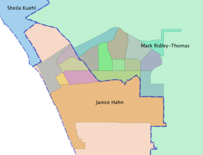 One interesting aspect to all this is how the districts have been drawn up over time. This is important to understand when you are speaking with someone as your neighbor, living in the same zip code or even neighborhood such as Playa Vista, may have a different representative than you for a particular topic. The County Supervisors Janice Hahn (district 4) and Mark Ridley-Thomas (district 2) pretty much bisect Westchester / Playa.