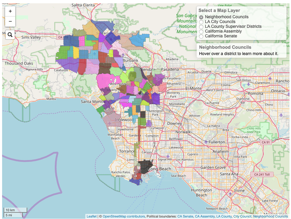 Click on snapshot above to explore your neighborhoods. Click on the eyeglass in the top left to enter an address to learn about (e.g., 1233 N McCadden Pl, Los Angeles). All of the representatives that cover the address located are presented below the map.
